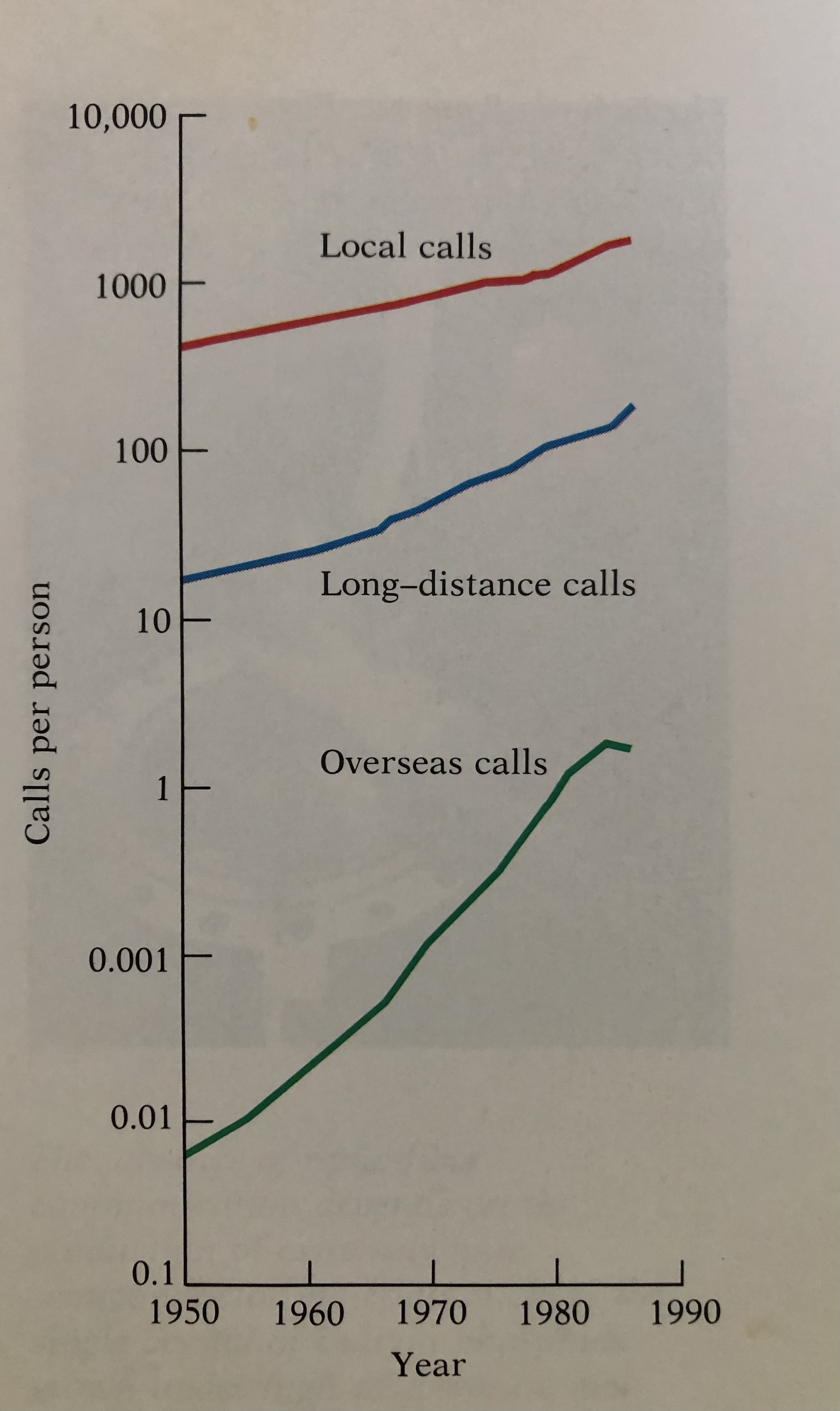 Following Telstar's launch, the number of overseas calls placed from the U.S. incresed more rapidly than local or long-distance calls. - John R. Pierce and A. Michael Noll.